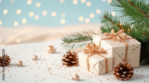 Beautifully wrapped gifts with golden bows, surrounded by pine cones and festive decorations, perfect for the holiday season.