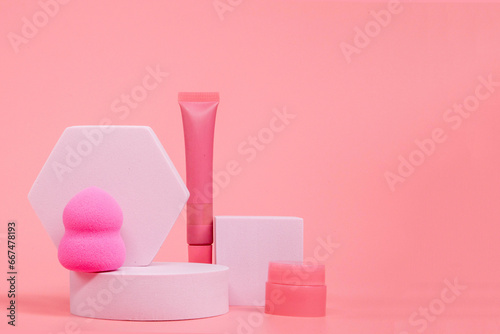 Beauty background with facial cosmetic products with empty copy space. Makeup, skin care concept with pastel colored background