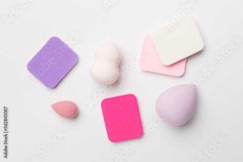 Beauty blenders on color background, top view