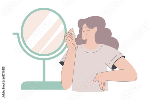 Beauty Care with Young Woman Apply Cream at Mirror Grooming Vector Illustration