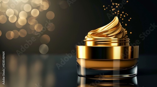 Beauty cosmetic product gold cream ads, package or liquid. 3D vector illustration on dark transparent background isolated. Stock vector.