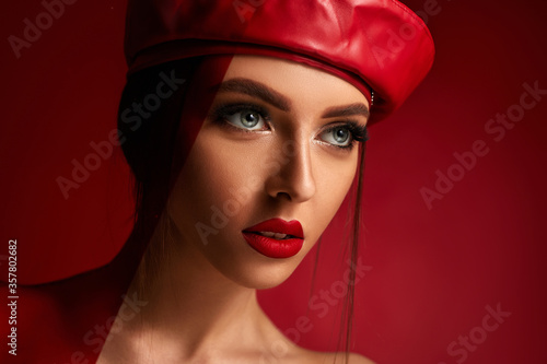 Beauty fashion portrait of woman in red leather beret in studio on red background. girl with luxurious make-up. copy space