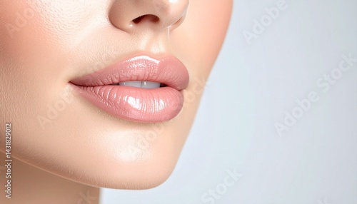 Beauty macro photo of full lips with clear gloss on a neutral background