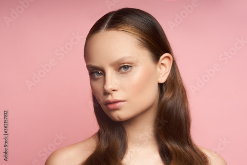 Beauty makeup. Portrait of a young girl with natural make-up on a pink background