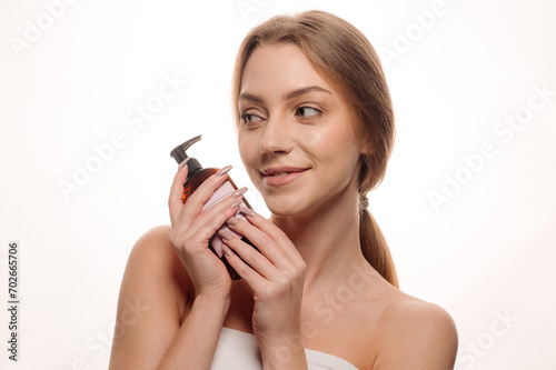 Beauty portrait of a girl holding a jar of cream on an isolated white background