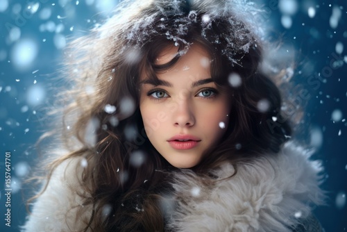 Beauty portrait of attractive young woman with long hair and fur, enjoying winter snowfall