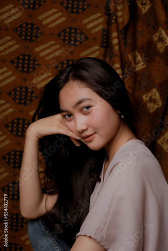 Beauty portrait of happy Asian woman face with natural skin on Indonesian Batik background.