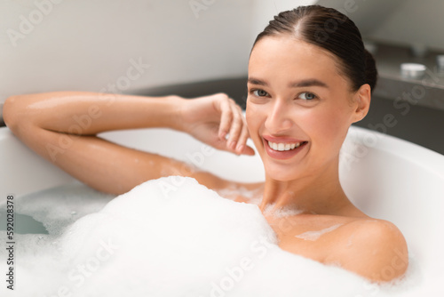 Beauty Portrait Of Pretty Female Taking Bath With Foam Indoors