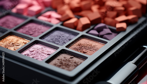 Beauty product collection vibrant colors, pink eyeshadow, shiny palette generated by AI