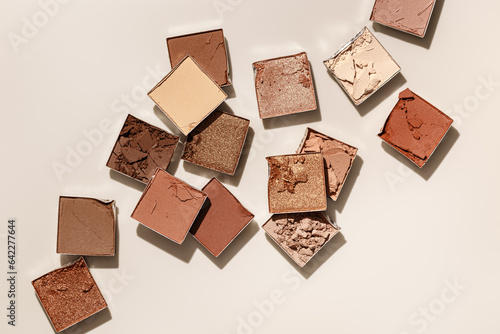 Beauty product neutral color eyeshadows for makeup, beige monochrome pattern on light background, flat lay with nude colors swatches eyeshade, cosmetic texture, beige color palette, top view pattern