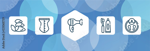 beauty salon outline icon set isolated on blue abstract background. thin line icons such as three stones, cor, hairdryer facing left, toothbrush and toothpaste, big scale vector. can be used for web
