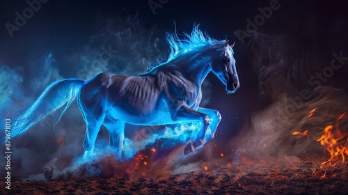 Beautyful arabian horse with fiery mane, jumping, blue fire flames and sand at night background. Horse with blue mane running in the smoke on dark background