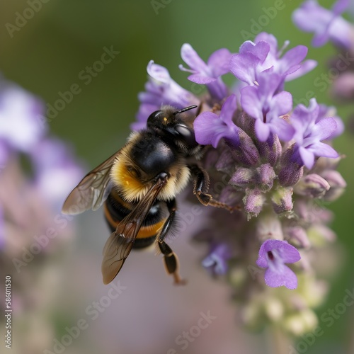 bee up close and pollinating a purple flower, ai