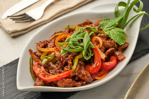 Beef Chilly Dry served in a dish isolated on grey background side view of fastfood