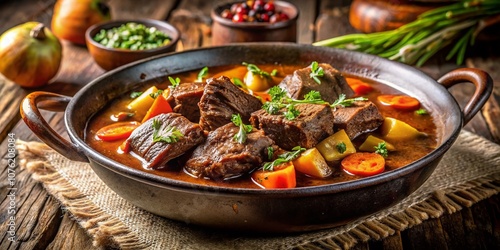 Beef Short Ribs Stew, Deep Focus, Gourmet Dish, Rich Flavor, Hearty Meal, Rustic Tableware