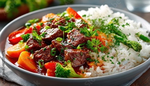 Beef stew with rice and vegetables