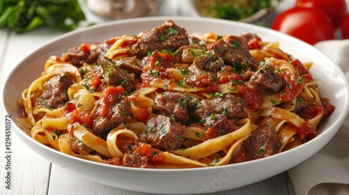 Beef Tagliatelle Pasta Dish, Tomatoes, Herbs, Kitchen Setting, Food Photography