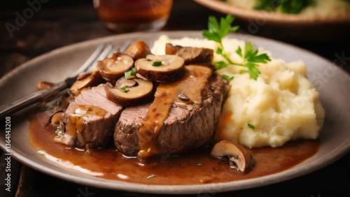 Beef Tenderloin with Mashed Potatoes and Mushroom Sauce on Gray Plate Delicious and Cozy Dinner Setting