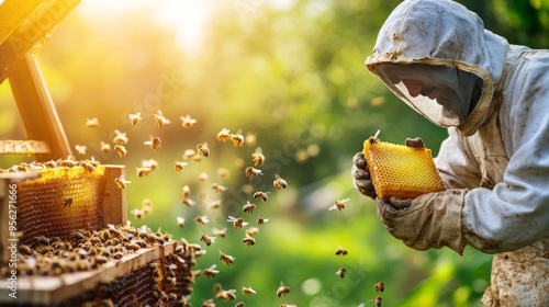 Beekeeper in protective gear inspecting honeycomb frame surrounded by bees in a sunny garden, emphasizing sustainable beekeeping practice.