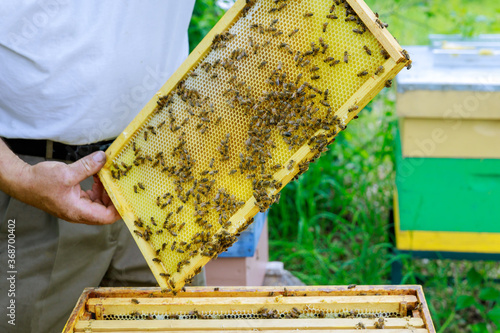 Beekeeping apiculture beekeeper works with bees near hives taking out frames with honeycombs for inspection