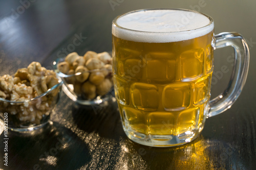 beer on the dark black wood near beer nuts