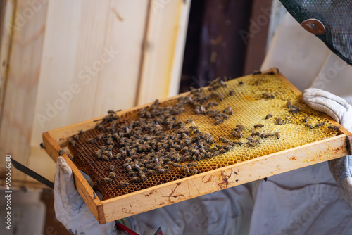Bees on a comb in the hands of a beekeeper inside a traditional swiss bee house