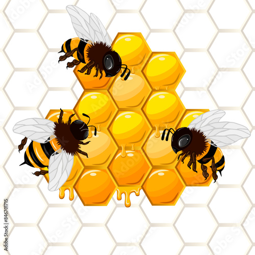 Bees on honeycombs in illustration.Colored vector illustration with bees on honeycombs.