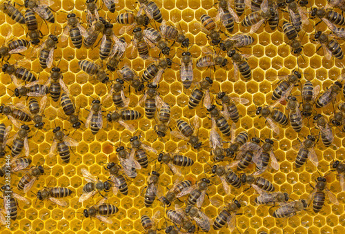 Bees on honeycombs with nectar and honey.
