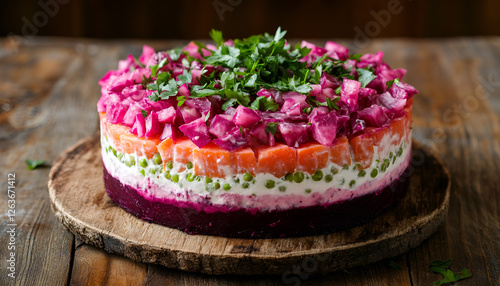 Beet salad. beetroot salad (vinegrette) with beetroot, potato, carrot, peas, cabbage and parsley over rustic wooden table