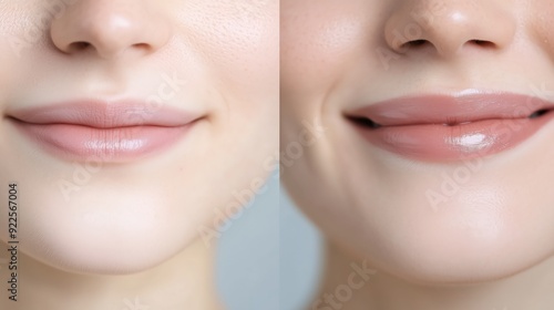 Before and after comparison of lip volumizing enhancement, transformation from thin to full, voluminous lips. Lip contouring advertisement