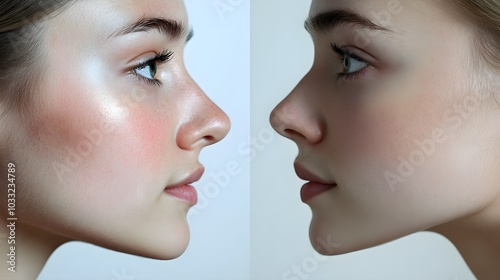 Before-and-after rhinoplasty comparison, highlighting changes in the nose's tip, bridge, and overall contour, focusing on improved symmetry and refined aesthetics