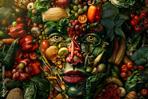 Behold, a human figure sculpted from an assortment of colorful fruits and vegetables, symbolizing the harmony between nutrition and artistic expression.