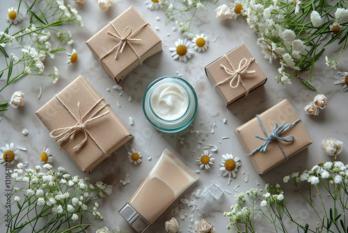 beige and white cosmetic vial and cream jars, gift boxes on gray, product design, top view