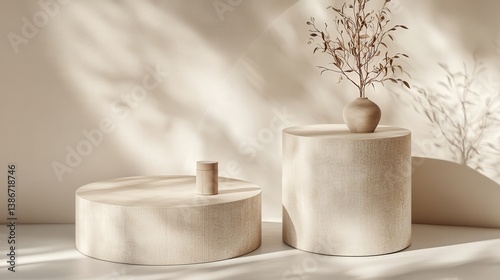 beige background and subtle leaf shadow patterns. Circular podiums provide a minimal stage for showcasing beauty products