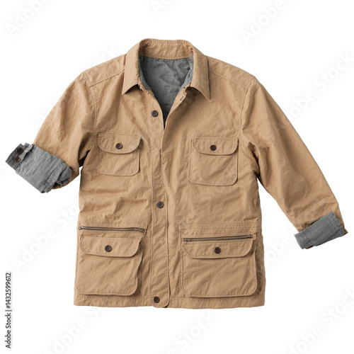 Beige canvas jacket with utility pockets clothing display transparent background isolated png stock