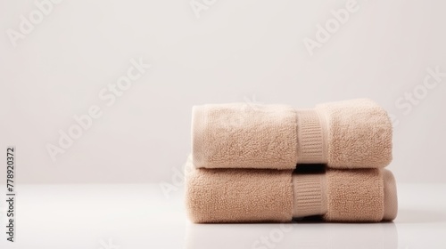Beige cotton towels on a white background. Bathroom decor and accessories.