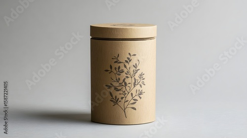 Beige cylindrical container with a delicate floral design sits against a plain light gray backdrop indoors.