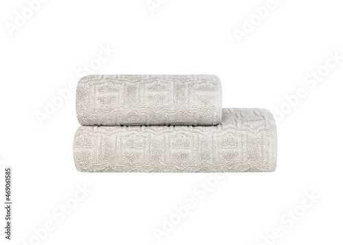 Beige duvet, blanket or bedspread. Wafer towels stack, grey towels in stack against the white backdrop. Pile, stock of thick organic cotton bath towels on white background. Beige plaid close up photo.
