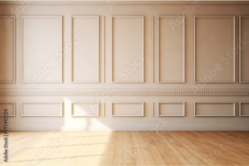 Beige elegant sunny emty room with moulding and oak parquet. generative ai.