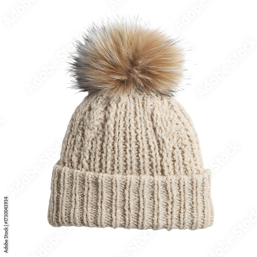 Beige knit beanie with faux fur pompom, soft winter fashion hat, white isolated background