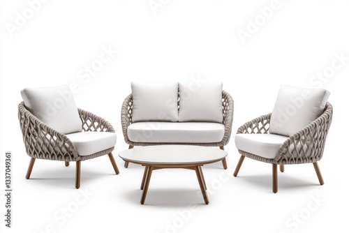 Beige outdoor wicker sofa set with cream cushions and teak wood legs