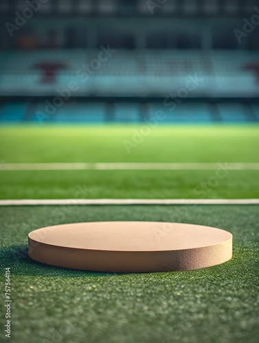 Beige round Platform for Product Presentation on a green Pitch. Blurred Sports Background