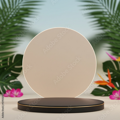 Beige round podium display with gold trim, circular backdrop panel framed by blurred tropical leaves and flowers. Empty summer stage for cosmetic showcase.
