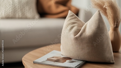 Beige throw pillow on wooden table in a cozy living room. Neutral tones and textures create a calm atmosphere.
