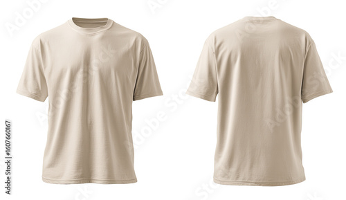 Beige t-shirt, front and back views. Blank, relaxed fit
