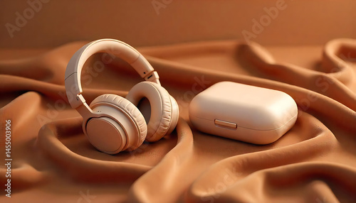 beige wireless over-ear headphones and its charging case on a rich brown velvet fabric background for ecommerce product shoot ads banner for web header template created with generative ai