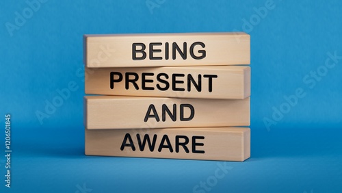 Being Present and Aware symbol. Wooden blocks with words Being Present and Aware.Psychology and Being Present and Aware concept.3D rendering on blue background.