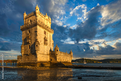Belem Tower is a fortified tower on the Tagus river at sunset. Lisbon. Portugal. UNESCO World Heritage Site. Top tourist attraction in Europe. Concept of travel and tourism.