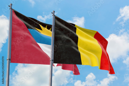 Belgium and Antigua and Barbuda flags waving in the wind against white cloudy blue sky together. Diplomacy concept, international relations.
