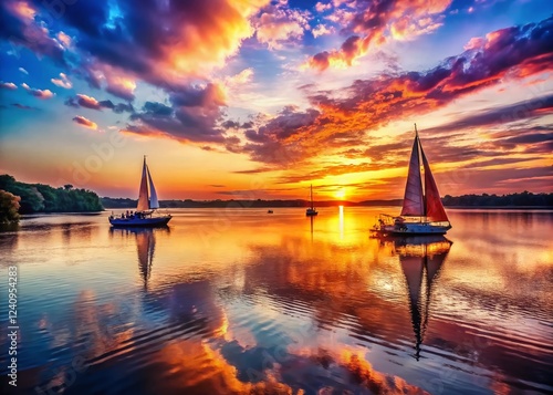 Belgrade River Confluence: Vibrant Sunset Sky & Sailing Boats Double Exposure Stock Photo